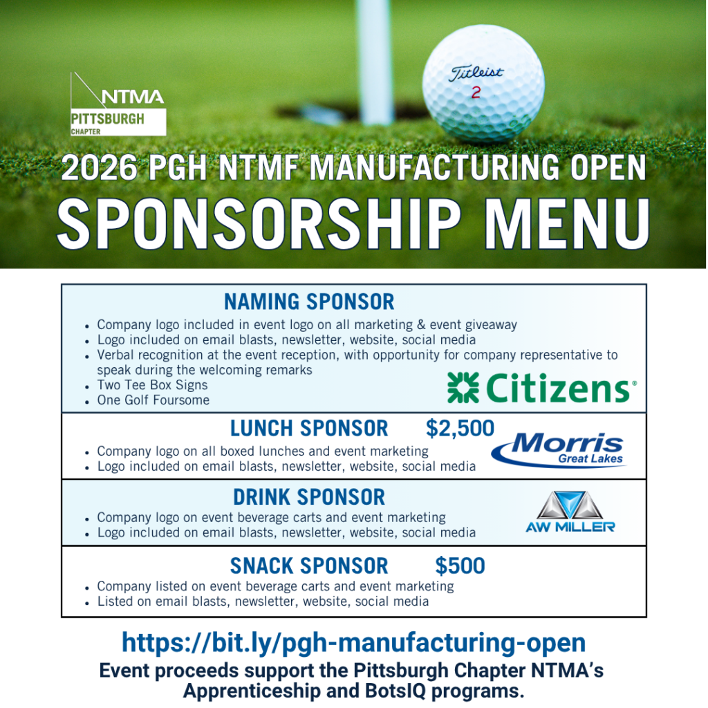 Since 1996 the Pittsburgh Chapter’s signature golf outing, The PGH NTMF Manufacturing Open, has raised thousands of dollars that go directly to manufacturing education in our region through programs like BotsIQ and the Apprentice Training Program. We’re committed to inspiring and educating the next generation of our workforce to keep manufacturing strong in Pittsburgh, in Pennsylvania and in America.